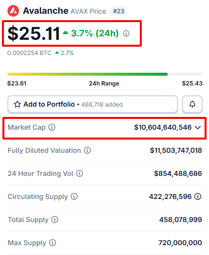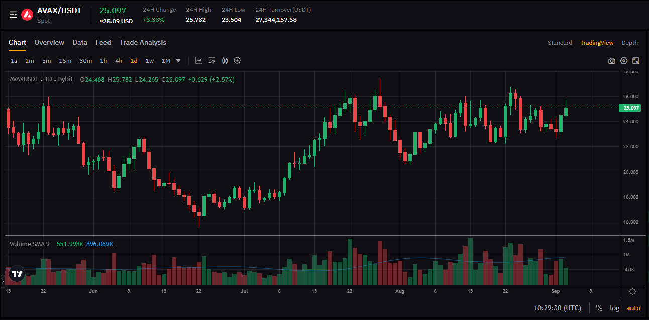 2025년 들어 AVAX는 시장 변동성 속에서도 긍정적인 움직임을 보이고 있습니다. 9월 3일 기준으로 AVAX 가격은 5% 상승하며 $24.50~$24.70 사이에서 거래되고 있으며, 비트코인 가격이 $111,000을 돌파한 영향으로 알트코인 랠리를 타고 있습니다.
