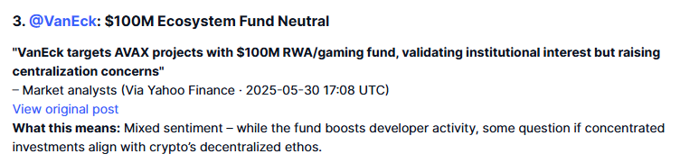 8월에는 일일 활성 주소가 57% 증가해 46,397개를 기록하며 네트워크 활동이 활발해졌습니다. 주요 이슈로는 반에크(VanEck)의 $100M 펀드 출시(2025년 6월) 후 실세계 자산(RWA) 프로젝트 온보딩 계획이 있으며, Octane 업그레이드(2025년 Q2/Q3)를 통해 확장성과 비용 효율성을 강화했습니다. 또한, Visa 결제 통합과 온체인 티켓, 로열티 프로그램 등 실생활 채택 사례가 증가하고 있습니다. X(트위터)에서도 아발란체(AVAX)의 가격 상승과 프로젝트 아이디어(예: SocialFi)가 활발히 논의되고 있어요.
