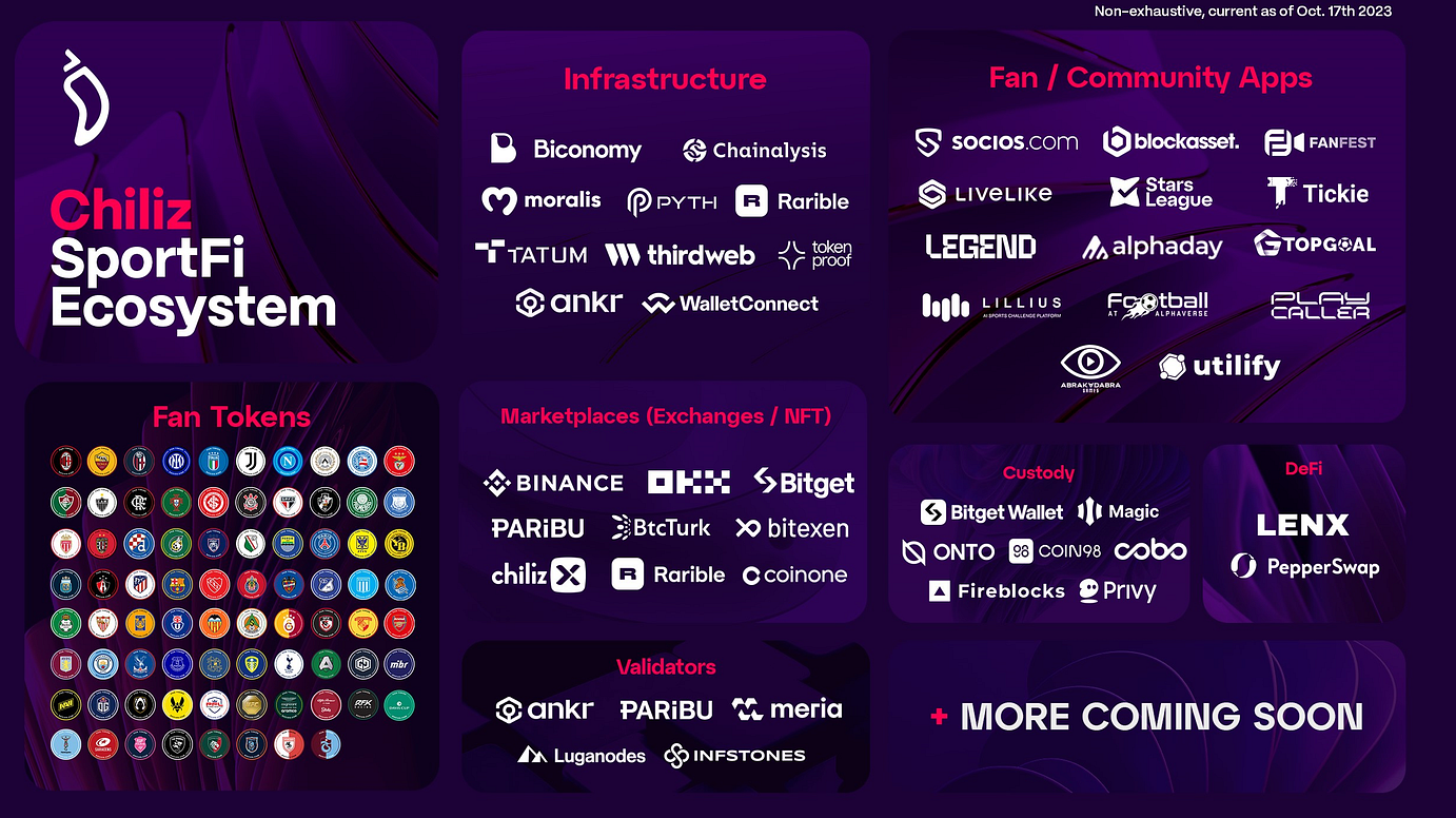 칠리즈 생태계는 70개 이상의 엘리트 스포츠 팀을 기반으로 하며, Socios.com 앱이 중심입니다. 이 앱은 무료 등록으로 팬 토큰을 보관, 스테이킹, 거래할 수 있게 해주며, Web3 스포츠 플랫폼으로 확장됩니다. 파트너십으로는 축구(57개 팀), e스포츠(6개), 모터스포츠(3개), MMA(2개), 테니스(1개) 등 150개 이상의 파트너가 25개국, 4개 대륙에 걸쳐 있습니다.