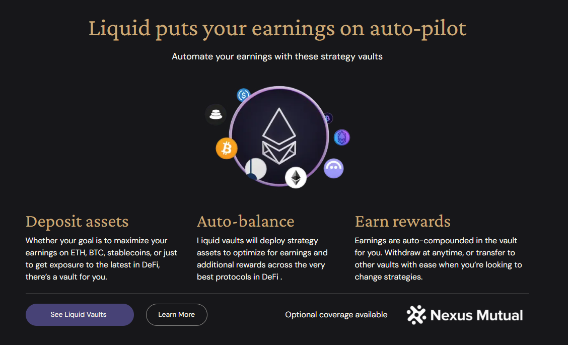 - Liquid Strategy Vaults: 자동화된 볼트로 DeFi 프로토콜 간 자산 배분을 최적화하고, 보상을 자동 복리. Nexus Mutual 보험 옵션으로 리스크 관리.