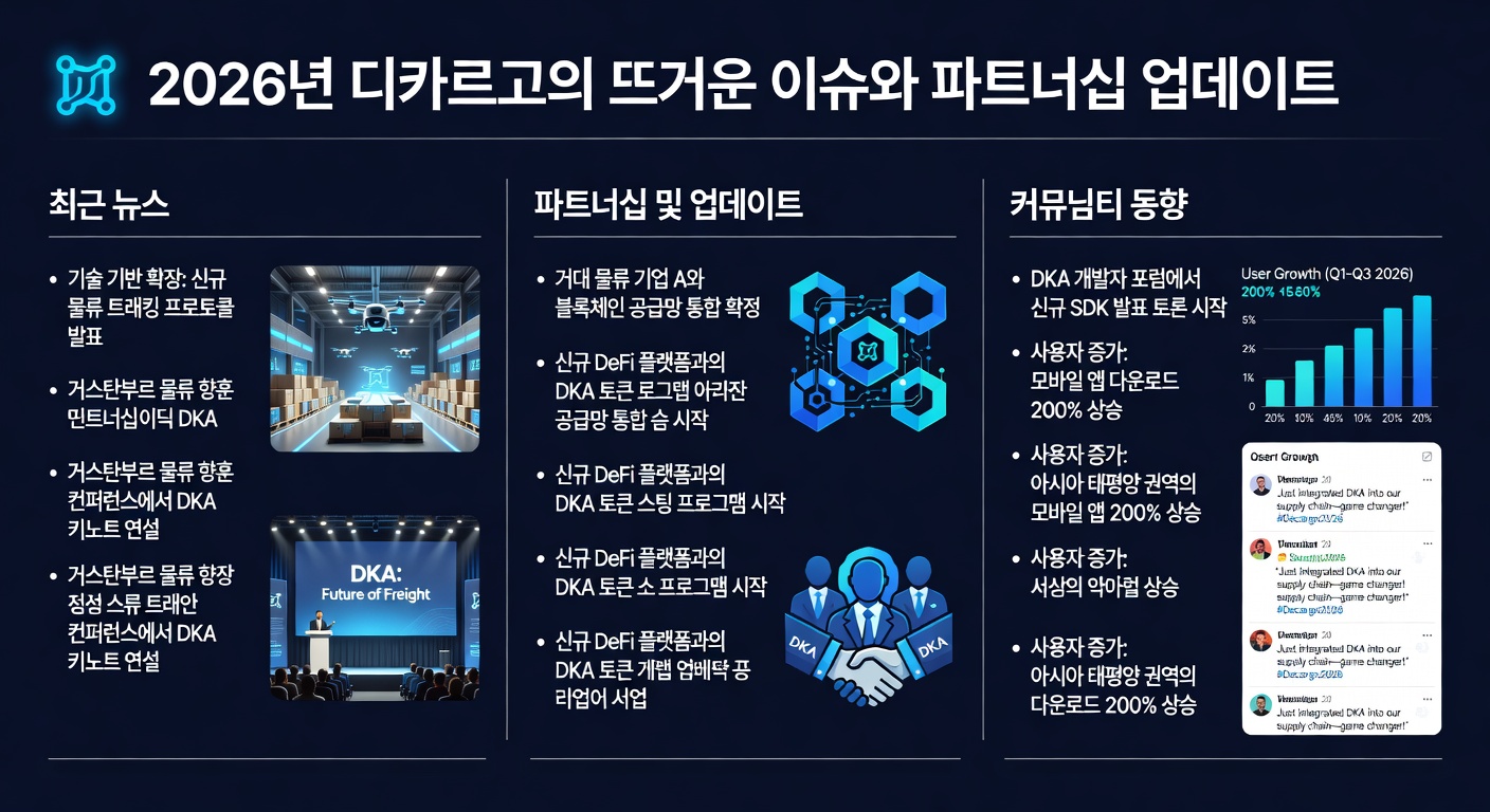 2026년 2월 20일, 디카르고는 아마존 웹 서비스(AWS)와의 파트너십을 발표하며 클라우드 기반 물류 솔루션을 강화했습니다. 이 협력으로 플랫폼의 데이터 처리 속도가 30% 향상되었으며, 글로벌 물류 네트워크 확장에 기여하고 있습니다 (출처: CoinGecko 뉴스 섹션). 또한, 3월 5일 업비트에서 DKA 토큰의 거래량이 급증하며 상장폐지 리스크를 극복한 사례가 주목받았습니다.