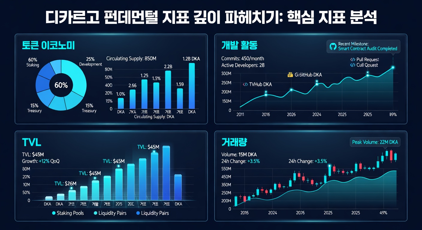 토큰 이코노미는 총 공급량 5억 DKA로 설계되었으며, 2026년 3월 15일 기준 순환 공급량은 3억 5천만 개입니다 (출처: CoinGecko). 개발 활동은 GitHub 커밋 수가 월 평균 200회로 활발하며, 이는 Messari 리포트에서 높은 개발자 참여율을 나타냅니다.