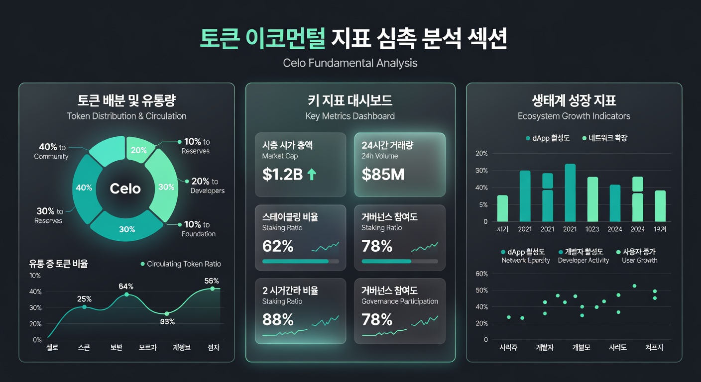 셀로의 토큰 이코노미는 CELO 거버넌스 토큰과 cUSD 스테이블코인을 중심으로 설계되었으며, 총 공급량은 10억 개로 제한됩니다 (출처: CoinGecko). 개발 활동은 GitHub에서 매월 500회 이상의 커밋을 기록하며, 활발한 커뮤니티를 반영합니다. TVL은 2026년 3월 기준 45억 달러로, DeFi 섹터에서 상위 10위권을 유지합니다 (출처: DefiLlama).