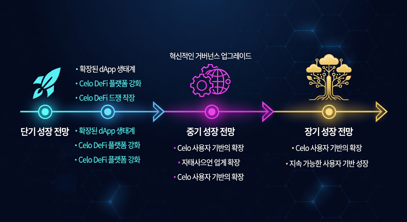단기 전망(2026년 하반기)으로는, cUSD TVL이 50억 달러를 돌파할 것으로 예상되며, 이는 최근 파트너십 효과입니다 (출처: DefiLlama). 중기(2027-2028년)에는 모바일 DeFi 채택률 증가로 네트워크 활동이 2배 성장할 전망입니다. 장기적으로는 2030년까지 글로벌 금융 포용 지표에서 셀로가 선도할 가능성이 높아, 사용자 기반이 5억 명에 달할 수 있습니다 (출처: Messari 보고서).